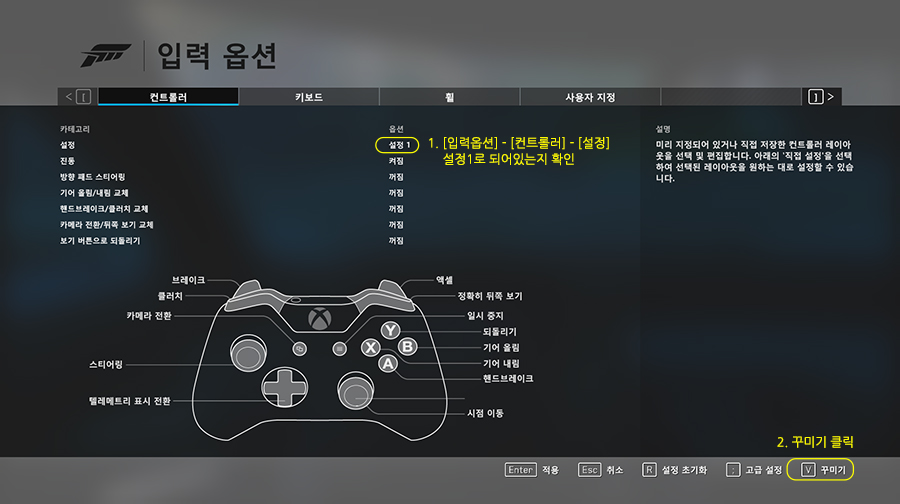 1. [입력옵션]-[컨트롤러]-[설정] 에서 설정 1로 되어있는지 확인