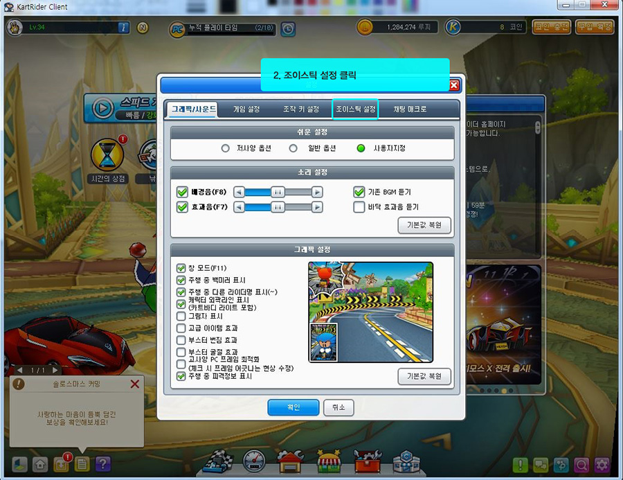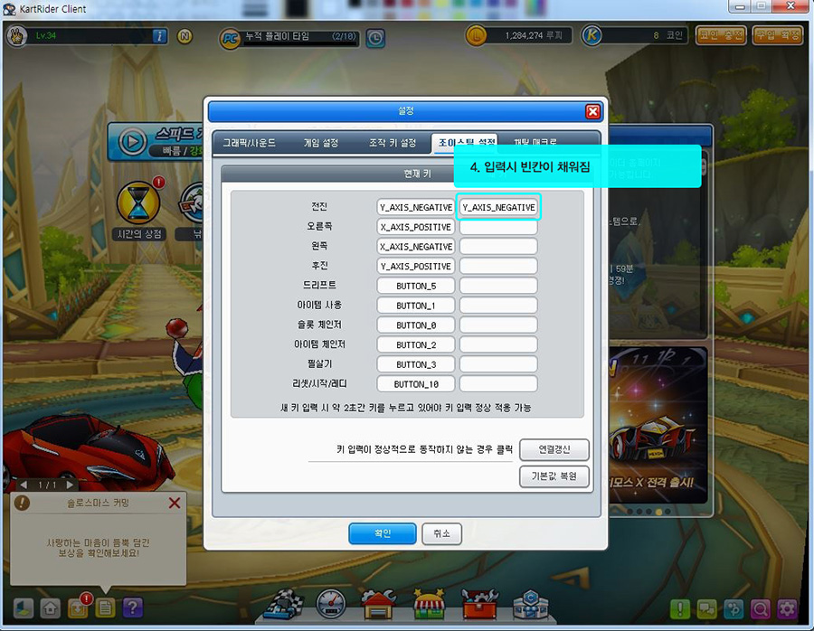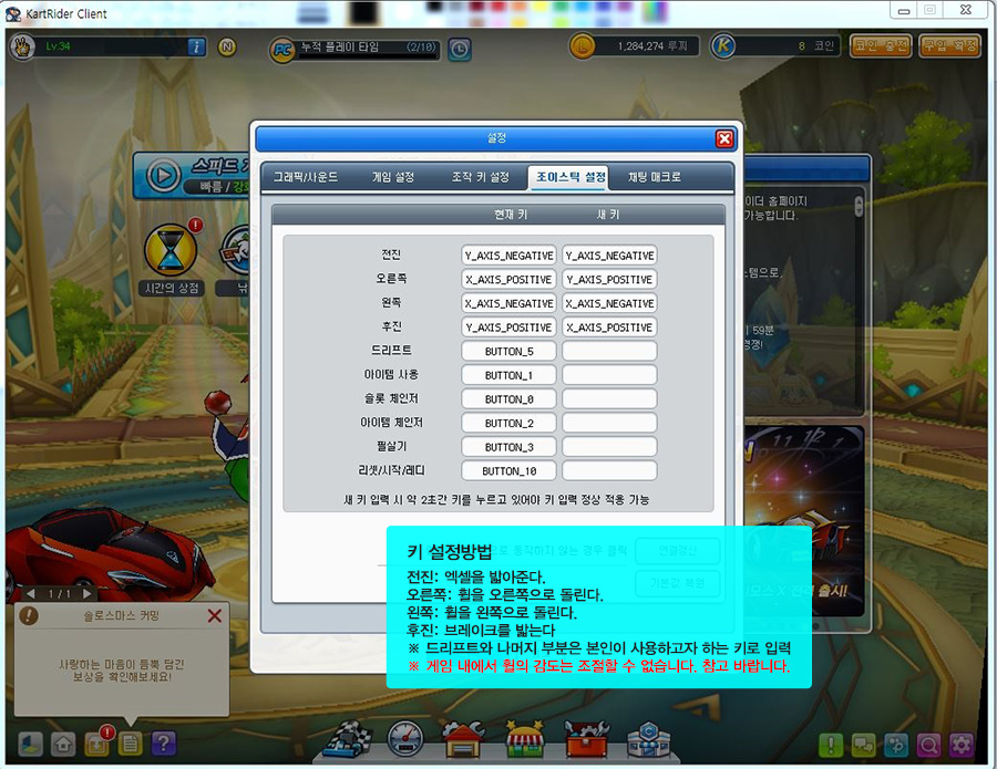 아우라 레이싱휠 카트라이더 설정방법 1. 먼저 홈 화면에서 설정 버튼을 클릭합니다. 2. 설정창 상단에 [조이스틱 설정]을 클릭합니다. 3. 각각의 칸을 클릭하고 원하는 키를 입력합니다. ※이때 아우라 레이싱휠에서 원하는 키를 2초 이상 길게 누르셔야 입력됩니다. 4. 입력시 빈칸이 채워진다. 5. 키 설정방법 -전진 : 엑셀을 밟아줍니다. -오른쪽 : 핸들을 오른쪽으로 돌립니다. -왼쪽 : 휠을 왼쪽으로 돌립니다. -후진 : 브레이크를 밟아줍니다. *드리프트와 나머지 부분은 사용하고자 하는 키로 입력합니다.
