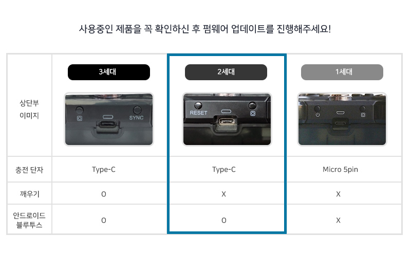 1세대는 안드로이드에서 블루투스 기능을 지원하지 않는 마이크로 5핀 충전케이블을 사용하는 제품이며