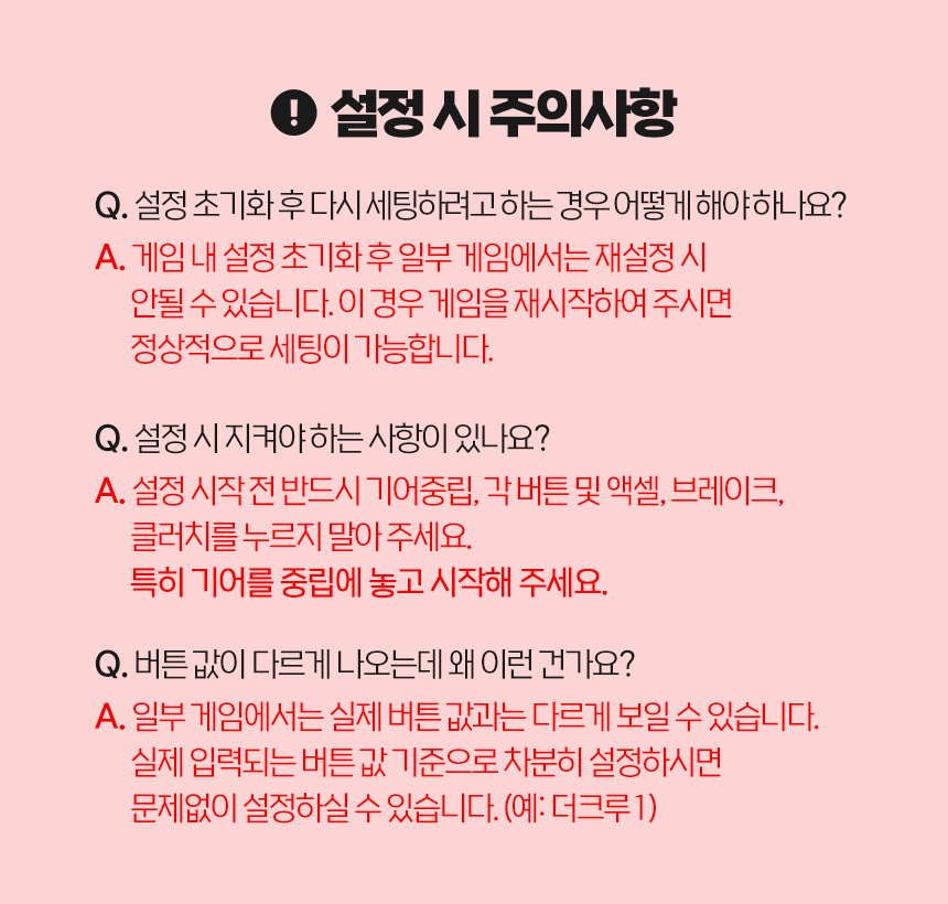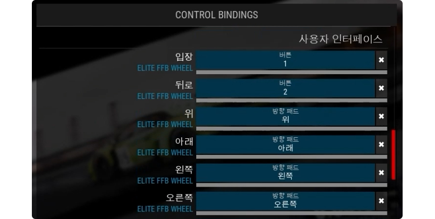 1. 게임 실행 > 옵션 > 컨트롤 탭을 선택 설정하려는 버튼을 키보드 Enter 또는 마우스로 클릭하면 설정 창이 뜨며 이때 엘리트 휠의 버튼을 누르면 설정됩니다. (다른 버튼의 설정 방법도 동일합니다.) 같은 방법으로 스티어, 스로틀, 브레이크, 클러치, 쉬프트 업/다운 등 모든 기능을 순서대로 커스텀 입력해 주세요.