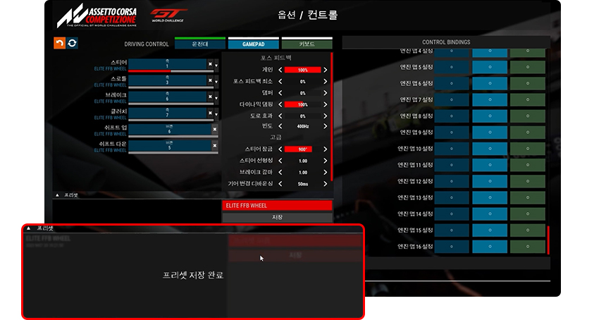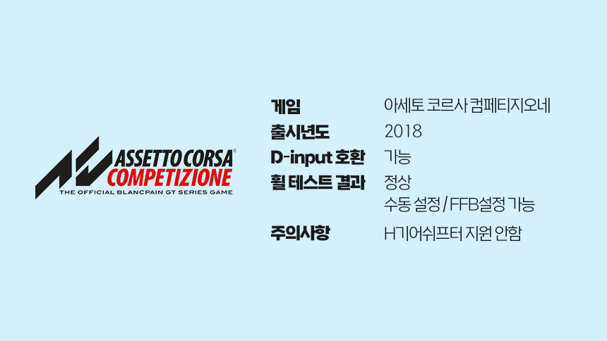 안녕하세요. 겜맥입니다 :) 엘리트 레이싱 휠 아세토 코르사 컴페티지오네 설정방법입니다. 차근차근 따라해보세요!