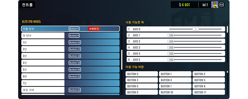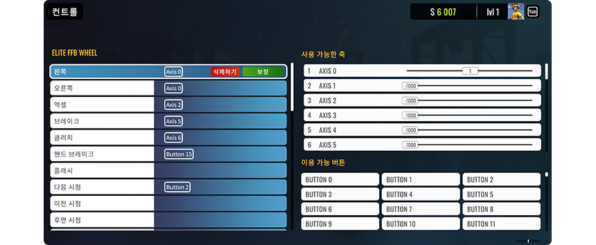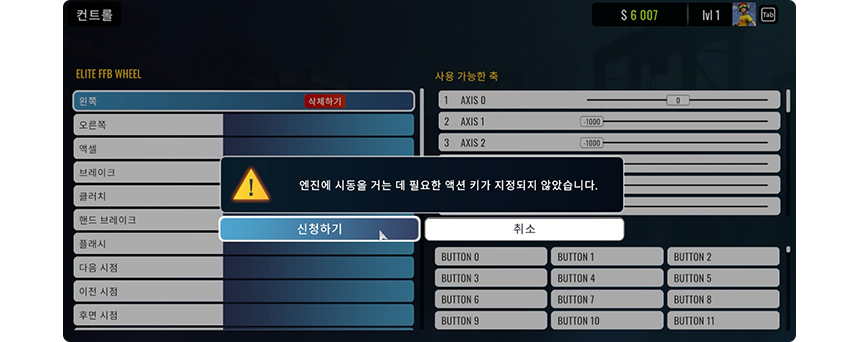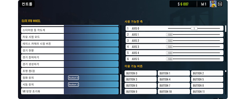 ![]() 1. 게임 실행 > 옵션 > 컨트롤 탭을 선택 장치에서 엘리트 휠이 활성화 되면 클릭 - "신청하기" 버튼 클릭 이후 왼쪽, 오른쪽, 엑셀, 브레이크, 클러치, 핸드 브레이크 등 모든 기능을 순서대로 커스텀 입력해 주세요.