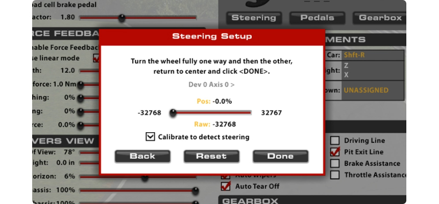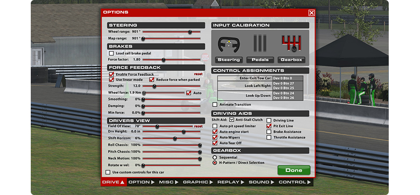 ![]() 각 기능마다 엘리트 휠을 사용하여 설정해 주세요 ex) 스티어링 : 엘리트 휠을 양방향으로 끝까지 돌린 후 중앙으로 위치 > "Done" 클릭 ![]() 모든 설정 후 “Done” 버튼을 눌러 게임화면으로 돌아갑니다. ![]() 고생하셨습니다. 즐거운 레이싱 게임 되시길 바랍니다 :)