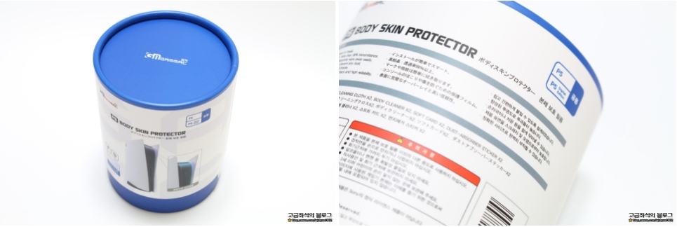 패키지는 이렇게 원통형으로 되어있었습니다! PS5본체의 유광면을 완벽하게 보호할 수 있는 바디 필름으로 먼지와 스크레치를 방지하며 지문 방지를 통해서 항상 깨끗한 상태의 PS5로 유지를 할 수 있습니다!