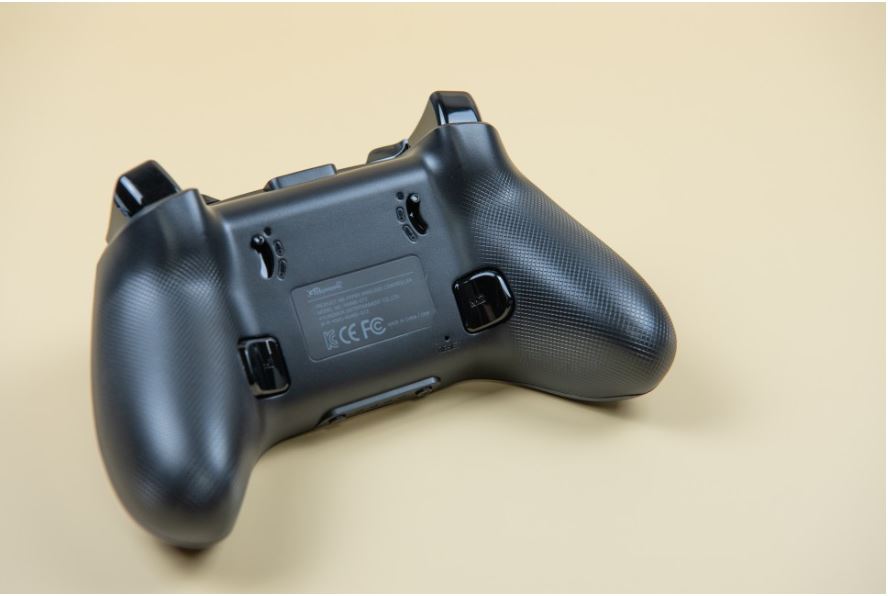 바닥면에는 좌우측 트리거 3단계 조절 스위치와 M1 매크로 버튼, M2 매크로 버튼, 리셋 버튼이 위치하고 있다.